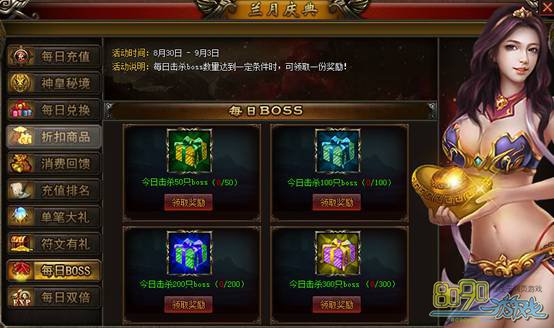 【活动说明】:每日击杀boss数量达到一定条件时,可领取一份奖励!