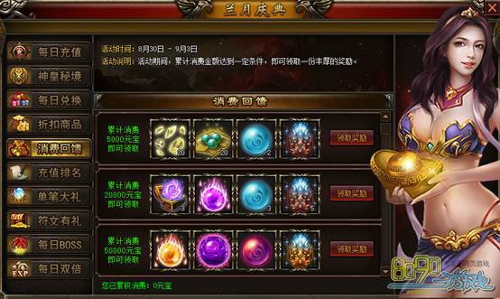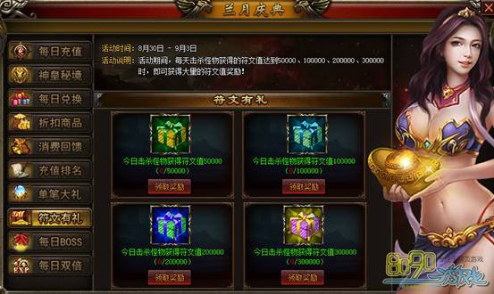 【活动说明】:活动期间,每天击杀怪物获得的符文值达到50000、100000、200000、300000时,即可获得大量的符文值奖励!