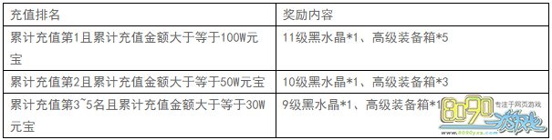 【活动说明】:活动期间,本服累计充值排名前5名便可获得丰厚奖励!排名第1更可获得11级黑水晶的奖励!累积充值300000元宝即可参与排名!活动结束后,奖励通过邮件发放!