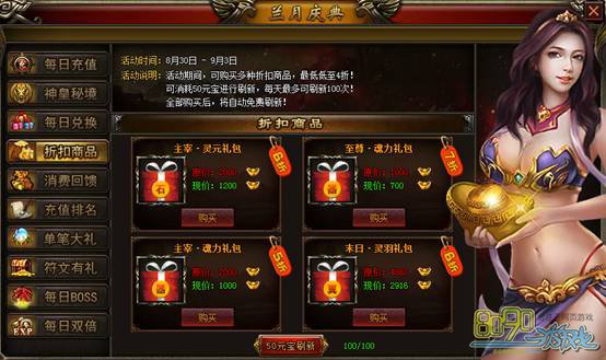 【活动说明】:活动期间,可购买多种折扣商品,全场最低低至4折!可消耗50元宝进行刷新,每天最多可刷新100次!全部购买后,将自动免费刷新!
