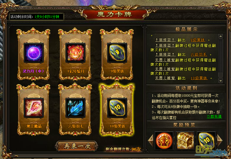 活动内容: 活动期间,每提取10000元宝即可获得一次翻牌机会,百分百中奖,更有神器等你来拿!每次翻牌从6张牌中抽取一张,必定获得奖励!翻牌时更有机会获取额外的翻牌次数哦!