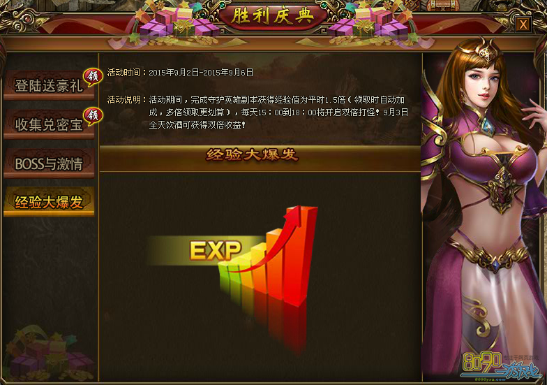 【活动内容】:活动期间,每天完成守护英雄任务可获得1.5倍经验加成,多倍领取更划算哦!每天15:00~18:00开启全服双倍打怪经验活动,9月3日当天全天饮酒可获得双倍收益!