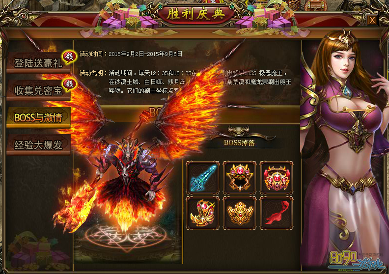 【活动内容】:活动期间,击杀胜利庆典怪物,打副本皆可掉落相关道具用于兑换礼包,活动期间,也可勾描黄金BOSS令牌,击杀后可掉落装备以及活动相关道具!