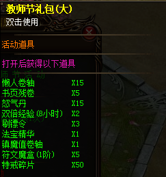 【活动内容】活动时间内,等级75级以上玩家每天击杀100个怪物能领取抗战胜利礼包一份;5号和6号领教师节礼包(小),7号领取的是教师节礼包(大)