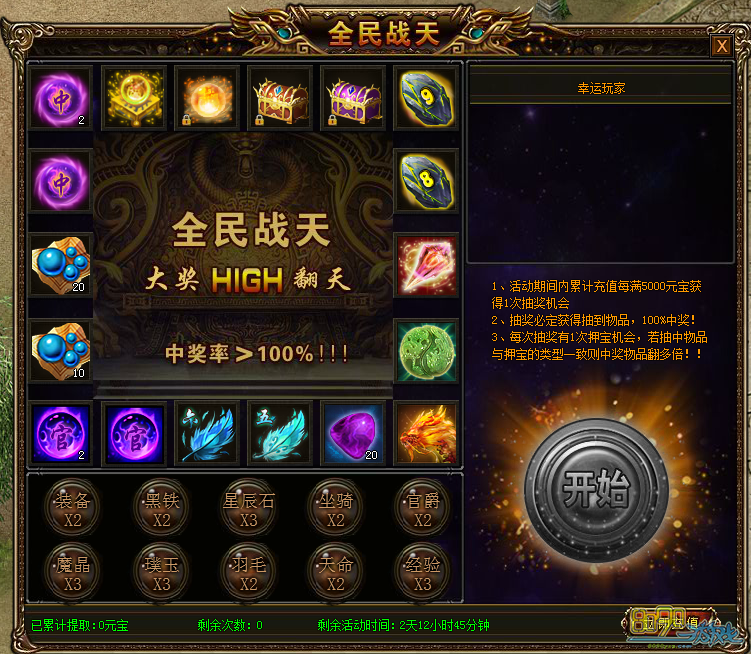 【活动内容】:活动期间,累计充值每满5000元宝可获得1次抽奖机会,抽奖必定获得物品,100%中奖,每次抽奖前有一次押宝机会,押宝花费少量元宝,押宝后抽奖如抽中押宝物品类型,则奖励翻多倍!