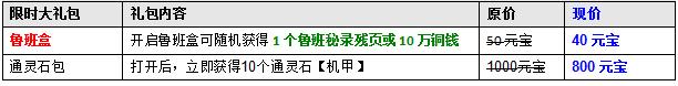 活动期间,特价道具限时上架,鲁班盒、通灵石包全新上架,助你实力倍增,战力大涨。全新礼包为限时出售,仅限活动期间购买,心动不如马上行动!