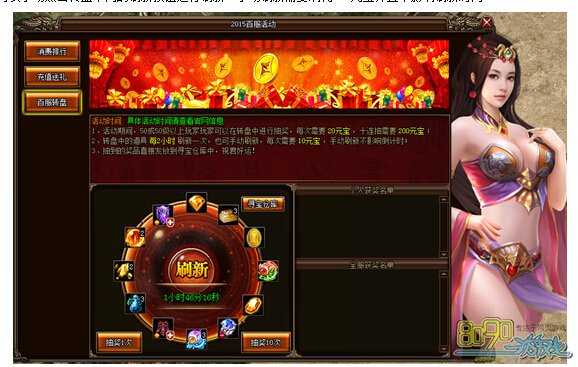 活动详情:活动期间50级或以上的玩家可以在百服转盘抽奖,转盘的奖励物品每2小时刷新一次,也可以手动点击转盘中间的刷新按钮进行刷新,手动刷新需要消耗10元宝并且不影响刷新时间。
