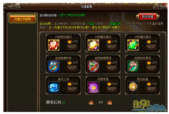 活动详情:活动期间,玩家每充值一元宝可获得一个充值红利,红利可用于购买活动中的丰富道具商品。注意:充值红利在活动结束后清零,请在活动期间内消费完哦。