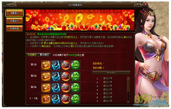 1. 在活动期间内,当天消费元宝排行前10的玩家且最低消费1000元宝都可以获得对应的奖励,奖励会在第二天发放,玩家上线就会在任务栏的右侧收到奖励提示。请给予背包足够的空间