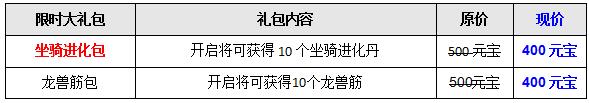 活动期间,特价道具限时上架,坐骑进化丹、龙兽筋包 全新上架,坐骑进化包抢到就是赚到,更有龙兽筋礼包超低折扣出手!新礼包为限时出售,仅限活动期间购买,心动不如马上行动!
