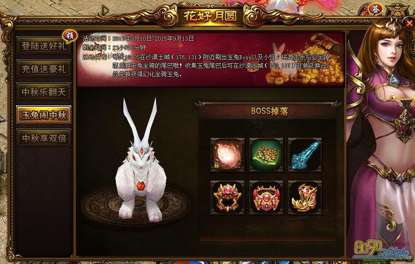 【活动内容】:中秋期间,通过击杀BOSS收集材料可兑换相应的奖励,其中使用莲蓉月饼和五仁月饼还有一定概率开出用于兑换玉兔幻化坐骑的道具—玉兔坐骑的尾巴!
