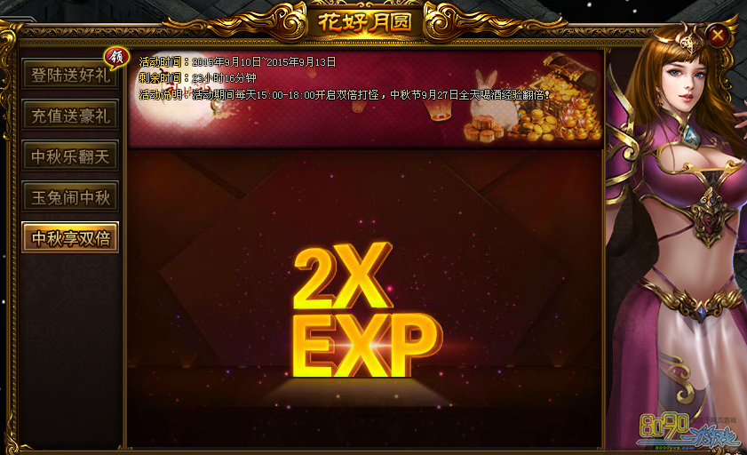 【活动内容】:活动期间,每天15:00~18:00开启双倍打怪,中秋节9月27日全天喝酒经验翻倍!