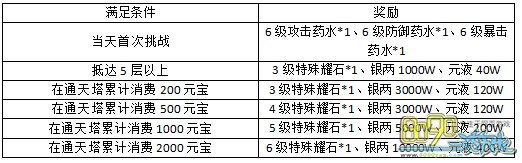 1. 通天塔分为18层,玩家达到活动等级需求即可免费进入,每挑战过一关后 需要消耗银两或元宝