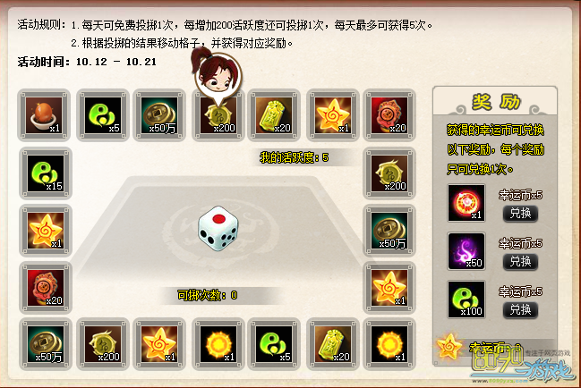1、每天可免费投掷1次,每增加200活跃度还可投掷1次,每天最多可获得5次。