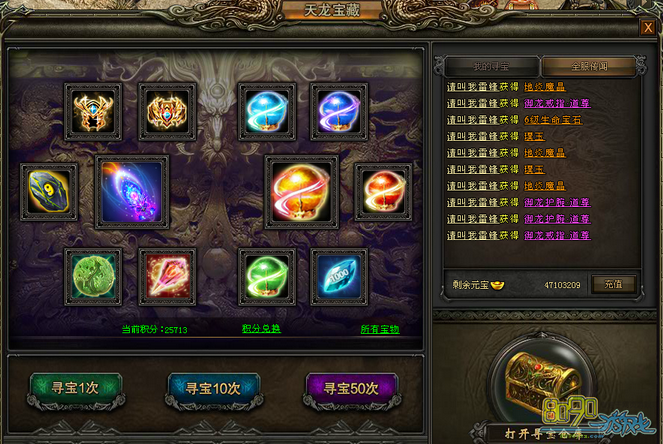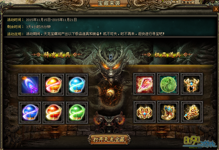 活动内容:活动期间,天龙宝藏中将产出紫龙鸿运扇(幻武)、9级宝石等各种珍稀道具!机不可失!