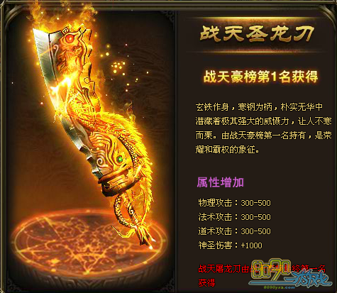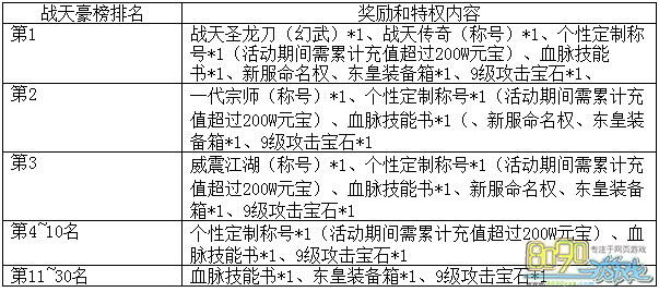 活动内容:活动期间,将进行全服的累计充值排名,排名前三十的玩家可进入此榜,截止至活动结束时,榜单第一、前三、前十、前三十的玩家均可获得大量丰厚奖励和特权,全服独一无二的幻武—战天屠龙刀以及各种绚丽称号等你来拿! 前十玩家还可获得自主定制称号哦!称号内容由你定!