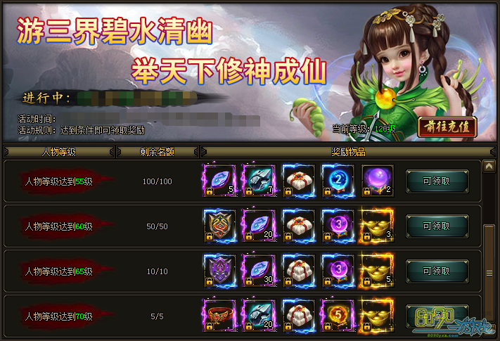 活动内容:新服开启前七天内,全服玩家只要分别达到45,50,55,60,65,70级的玩家即可获得丰厚大礼,其中高档次的奖励有人数限制哦,各位仙家赶快拿起你们手中武器为了荣誉战斗把!