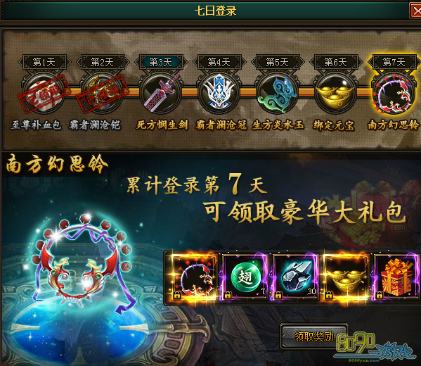 第七天登陆奖励:神器幻思铃*1,翅膀进阶丹*7,强化石*30,3倍经验丹*1,500绑定元宝*1
