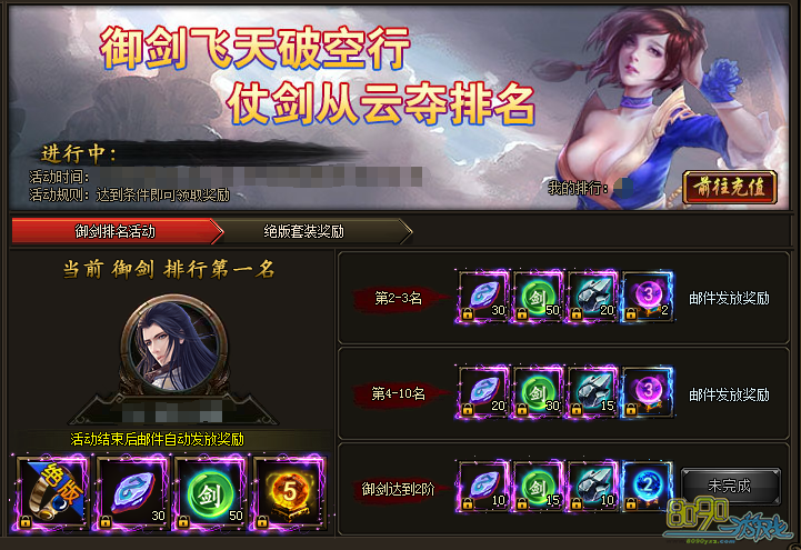 第一名奖励:霸者·澜沧戒*1,提品石*30,御剑进阶丹*50,五倍经验丹*1