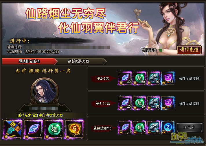 第二名~第三名奖励:提品石*30,翅膀进阶丹*50,强化石*20,三倍经验丹*2