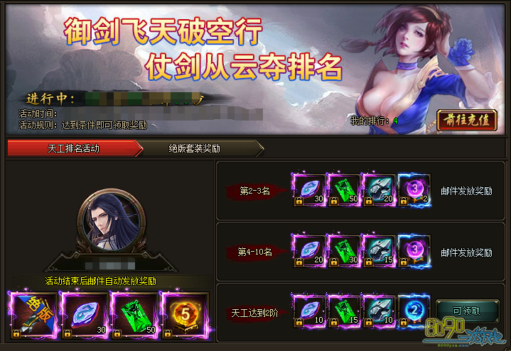 活动内容:在活动时间内游戏中仙剑进阶最高的前10名玩家可获得丰厚奖励,第1名玩家更可以拥有50级极品澜沧戒一件,当然我们还特设了阳光普照奖凡是在活动时间御剑进阶到二阶都可获得奖励哦。