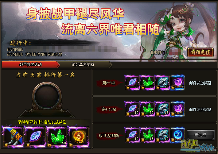 活动内容:在活动时间内游戏中天裳进阶最高的前10名玩家可获得丰厚奖励,第1名玩家更可以拥有50级极品澜沧靴一件,当然我们还特设了阳光普照奖凡是在活动时间战甲进阶到二阶都可获得奖励哦