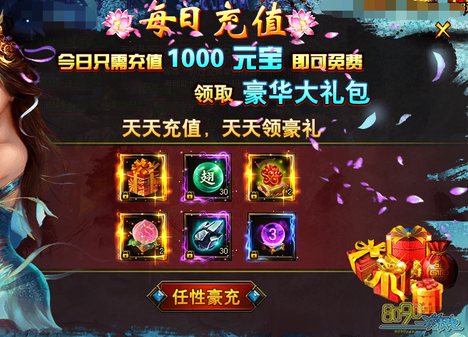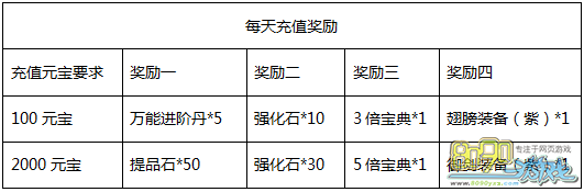 活动内容:每日充值,好礼惊喜不断。凡是在活动期玩家每天充值达到指定元宝即可获得丰厚的回馈大礼!不同奖励内容给您惊喜程度绝对超乎您的想象!