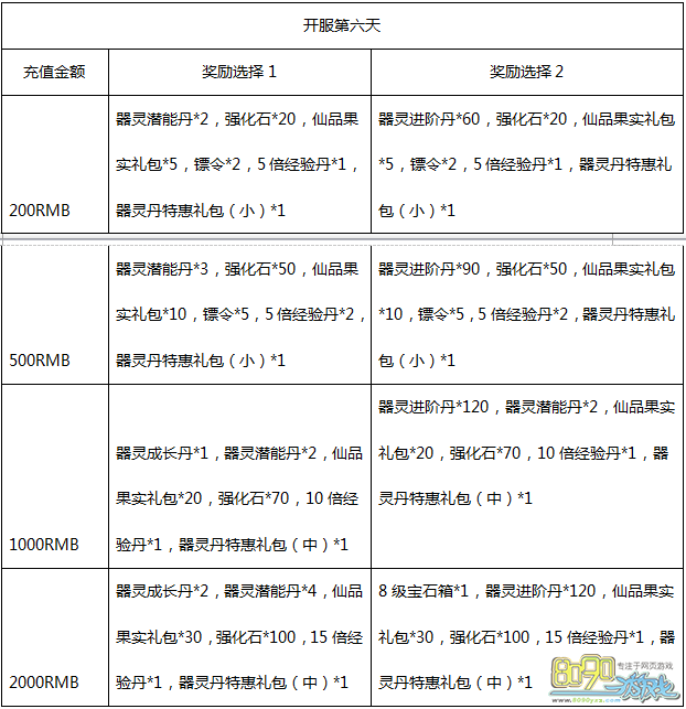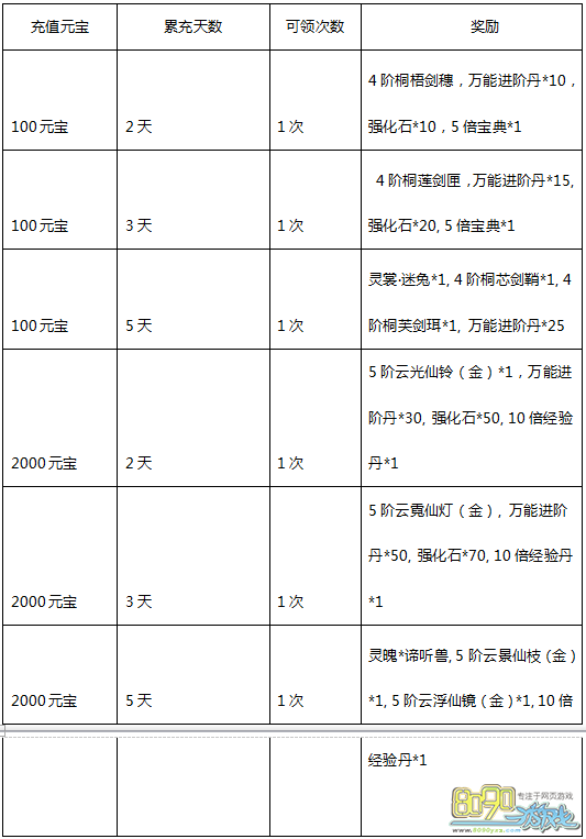 2000元宝 2天 1次 5阶云光仙铃(金)*1,万能进阶丹*30, 强化石*50, 10倍经验丹*1