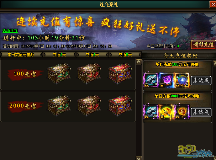 活动内容:玩家可以每日连续充值获得精美豪礼,连续充值天数越多奖励则越豪华哟!