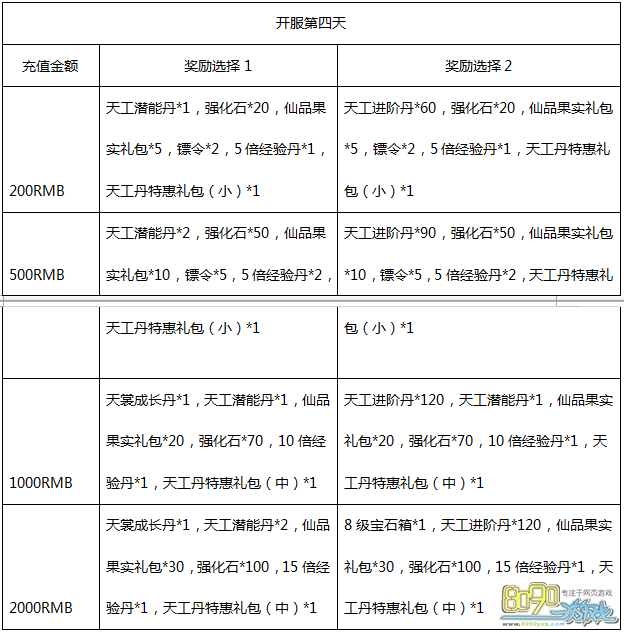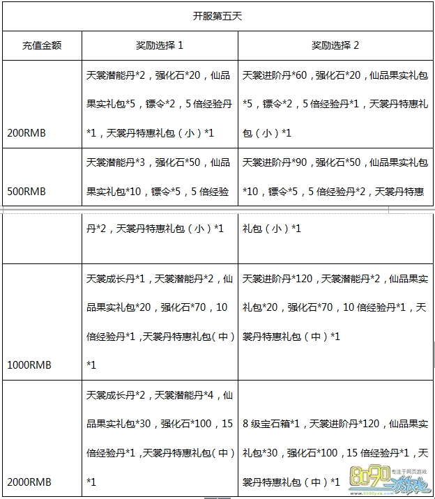 第五天登陆奖励:神器炎水玉*1,翅膀进阶丹*5,强化石*10,还魂石*3,100银两*2,