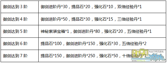 活动内容:在活动时间内凡是玩家御剑达到了规定阶数即可活动丰厚的大礼作为您的回报哦。