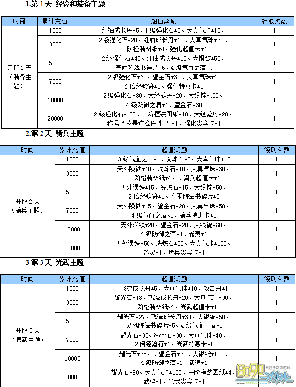 【活动内容】开服七天内,每日充值达到一定的数额,均可领取充值大礼包一份,不要错过喔!