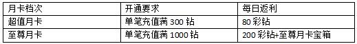 活动内容:开服后,玩家在头像上方看到月卡标示,月卡分为超值月卡及至尊月卡,充值满指定金额的钻石可开通相应的月卡,开通月卡后可每日领取返还的彩钻,开通至尊月卡可额外每日领取宝箱。