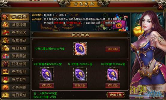 【活动说明】:每日充值金额达到一定条件时,可领取一份奖励。