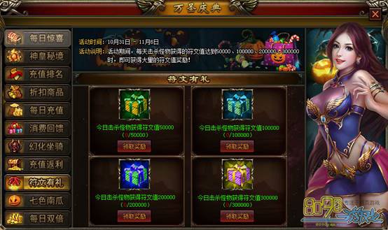 【活动说明】:活动期间,每天击杀怪物获得的符文值达到50000、100000、200000、300000时,即可获得大量的符文值奖励!