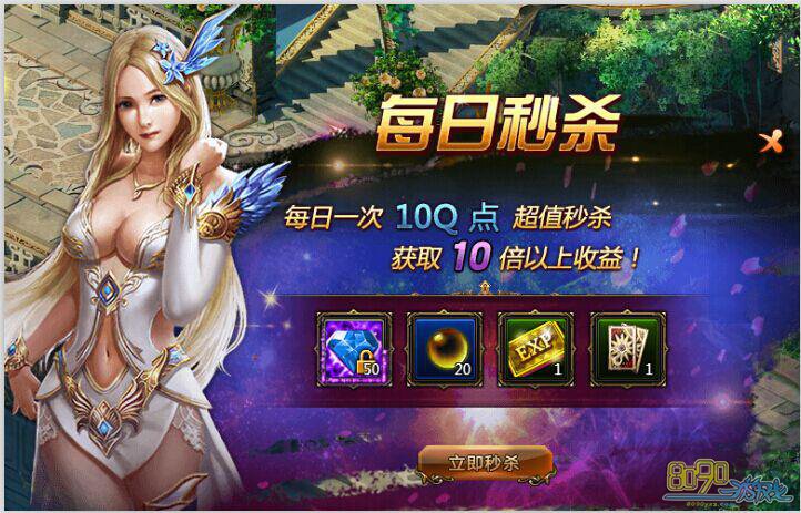 【活动内容】开服后玩家每天可以进行一次超值秒杀,花费10Q点就可获得10倍以上收益。