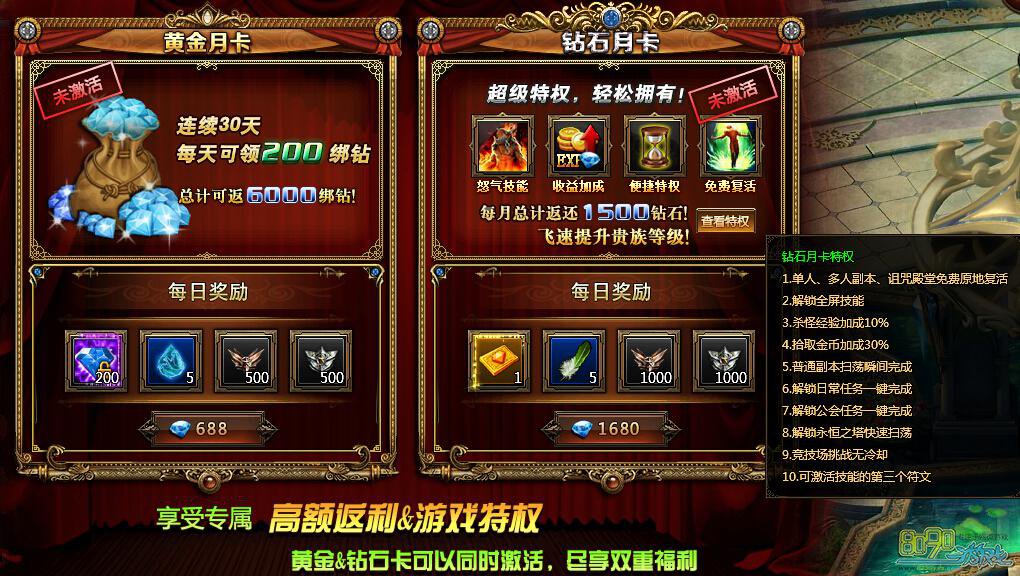 【活动内容】开服后玩家可以在游戏内购买黄金月卡(30天)、钻石月卡(30),每天均可领取高价值礼包,获得超值收益。