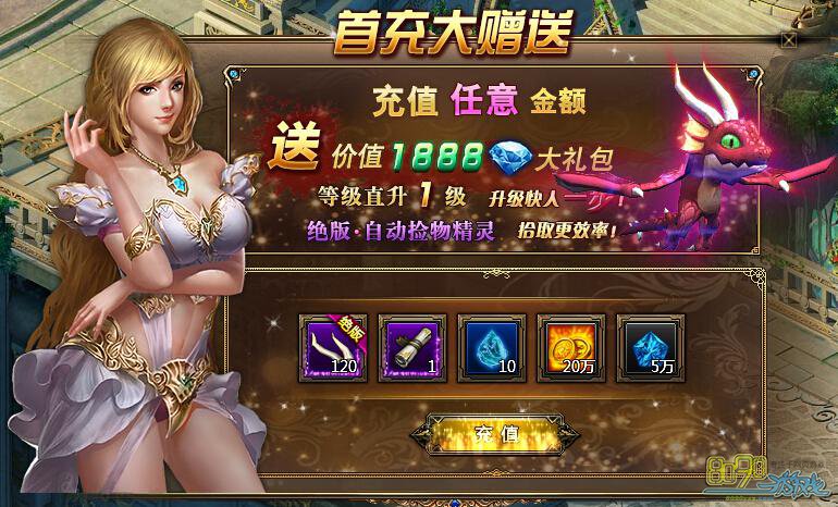 【活动内容】玩家登陆游戏进行首次充值(充值额度不限),除了可以获得相对应的钻石和VIP经验值外,还可以额外领取
