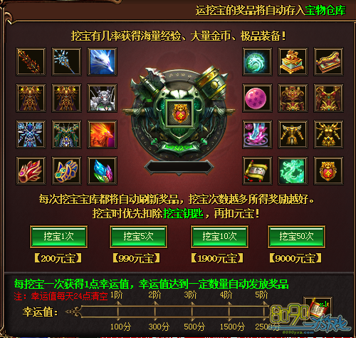 2、活动期间内,幸运挖宝内将有几率挖出特殊顶级装备 “赤月主宰神兵” “赤月主宰神甲” “赤月主宰龙珠”“赤月主宰虎符”“赤月主宰玉佩”“赤月主宰玉玺” “天威虎王甲” “雅典娜圣衣(女)” “波塞冬圣衣(男)”以及顶级武器.衣服.首饰.高级特戒等装备。