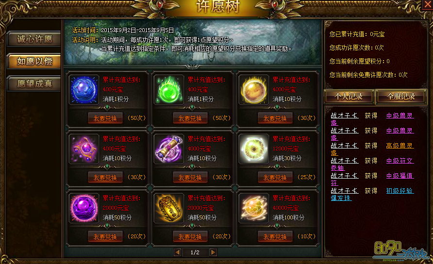 活动说明:活动期间,每累计充值2000元宝,即可获得1次免费许愿次数!同时您也可以花费元宝直接进行许愿,许愿优先消费免费许愿次数!成功许愿1次,即可获得1点许愿积分,积分可在【如愿以偿】处兑换极品奖励!