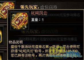 累计充值排名第1且累计充值大于100W元宝11级黑铁*1、叱咤风云(称号)*1