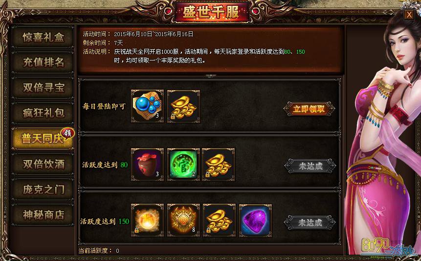 【活动内容】: 活动期间,每天玩家登录和活跃度达到80、150时,均可领取一个丰厚奖励的礼包