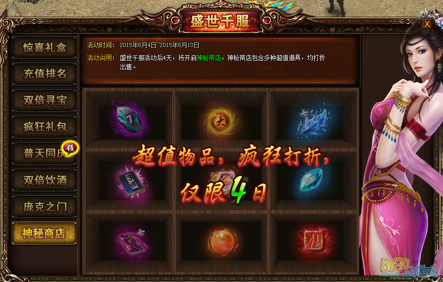 【活动内容】: 千服庆典最后四天,将开启神秘商店,神秘商店包含多种超值道具,均超级折扣出售。