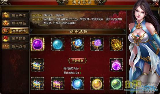 【活动说明】:活动期间,只要消费满1000元宝,即可获得一次抽奖机会,抽奖可以获得各种奖励,还有混沌的紫色装备哟!!!