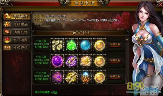 【活动说明】:每天充值1000、5000、10000、30000、50000元宝,可获得一份奖励。