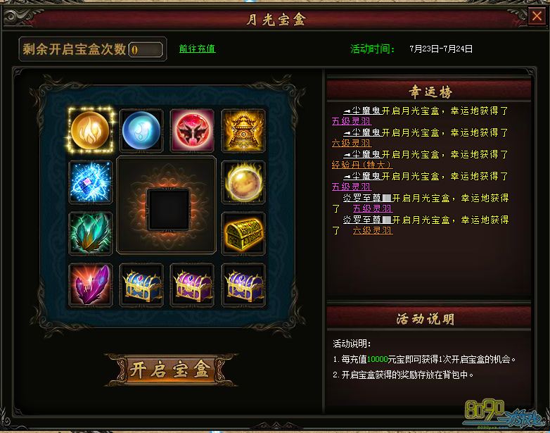 【活动奖励】:活动期间,每充值10000元宝即可获得1次开启宝盒的机会,每次开启百分百获奖,开启宝盒即可从界面展示的道具中随机获得一个,更有几率获得神器、10级黑水晶等极品道具,活动获得的奖励物品直接发放至背包中。