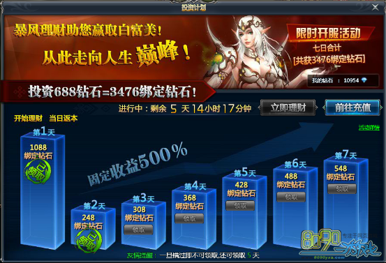 【活动内容】:由风暴大陆最专业的理财专家为您提供的理财服务,仅需投资688钻石,即可领取500%超值收益,从此走向人生巅峰!
