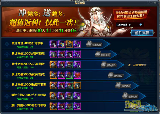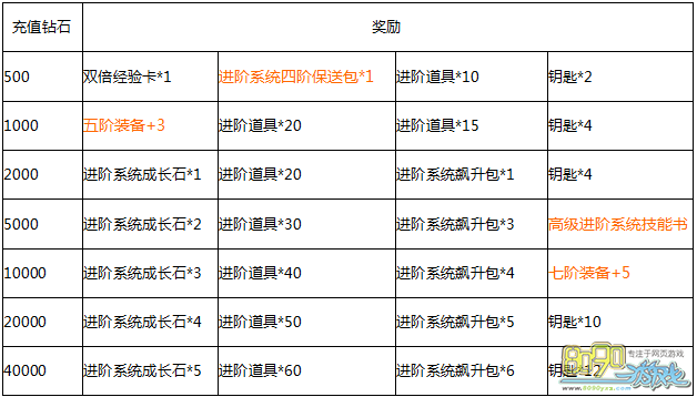 【活动内容】:每天充值任意金额,即可获得价值2888钻石的首充道具奖励!首次充值即可获得极品橙色武器+5,超级经验药,超强宠物技能,还有各种进阶系统极品装备和进阶道具,绝对值得拥有!