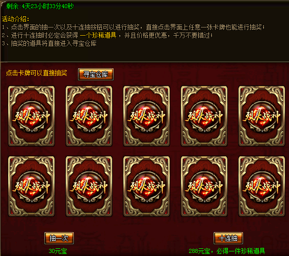 活动期间,玩家点击抽一次(30元宝)或十连抽(288元宝)进行抽奖,也可直接点击界面上的一张卡牌进行一次抽奖(30元宝),十连抽价格优惠并且必定获得一个珍稀道具,抽奖获得道具进入玩家寻宝仓库。