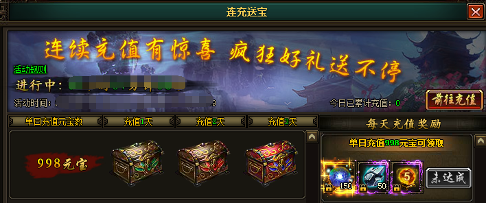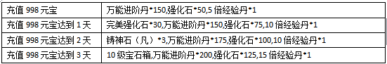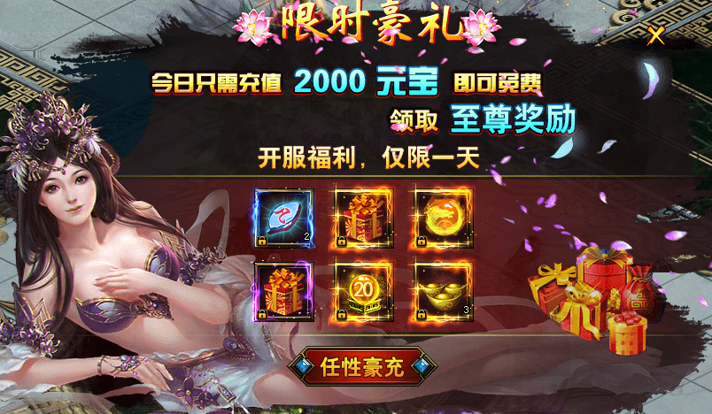 活动内容:玩家充值达到2000元宝后即可领取超值奖励!!